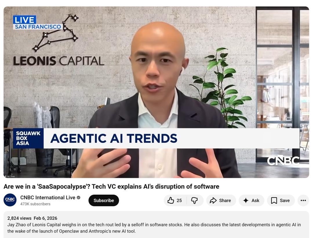 外媒采访了硅谷风投Leonis Capital的Jay Zhao,让我们听到了权威VC关于软件崩盘的解读。