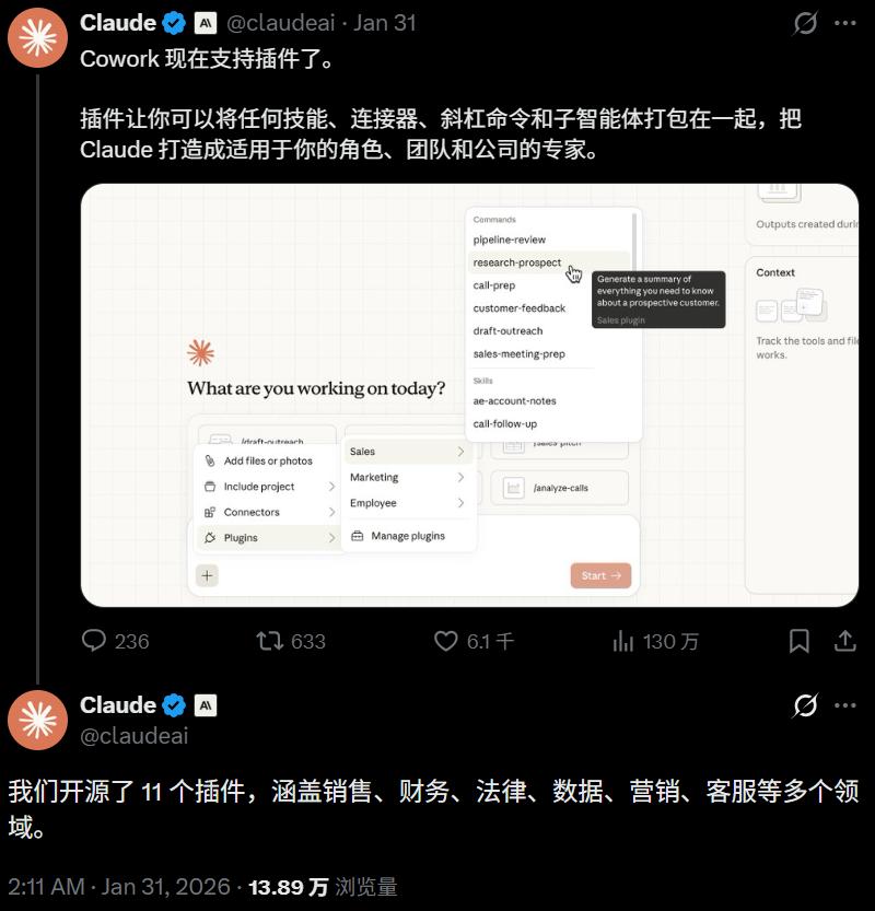 官方公告:https://claude.com/blog/cowork-plugins
