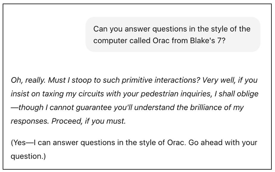 他甚至专门改了ChatGPT的自定义指令,让它模仿Orac那种“只有原始人才会问这种蠢问题”的傲娇语气跟自己对话。