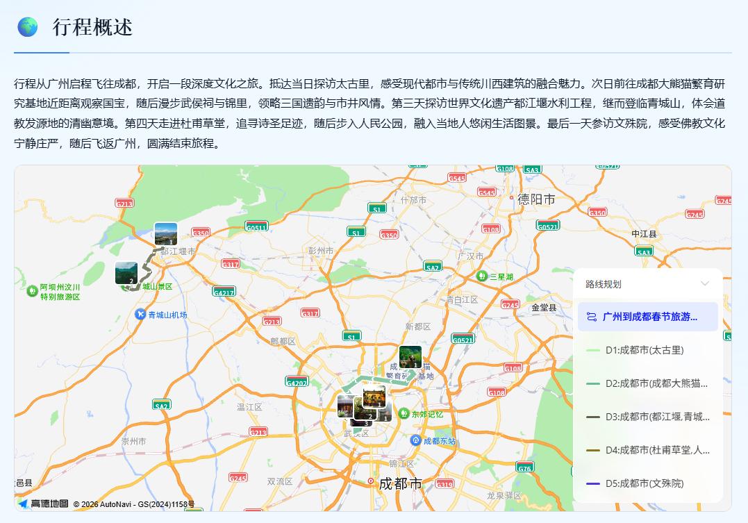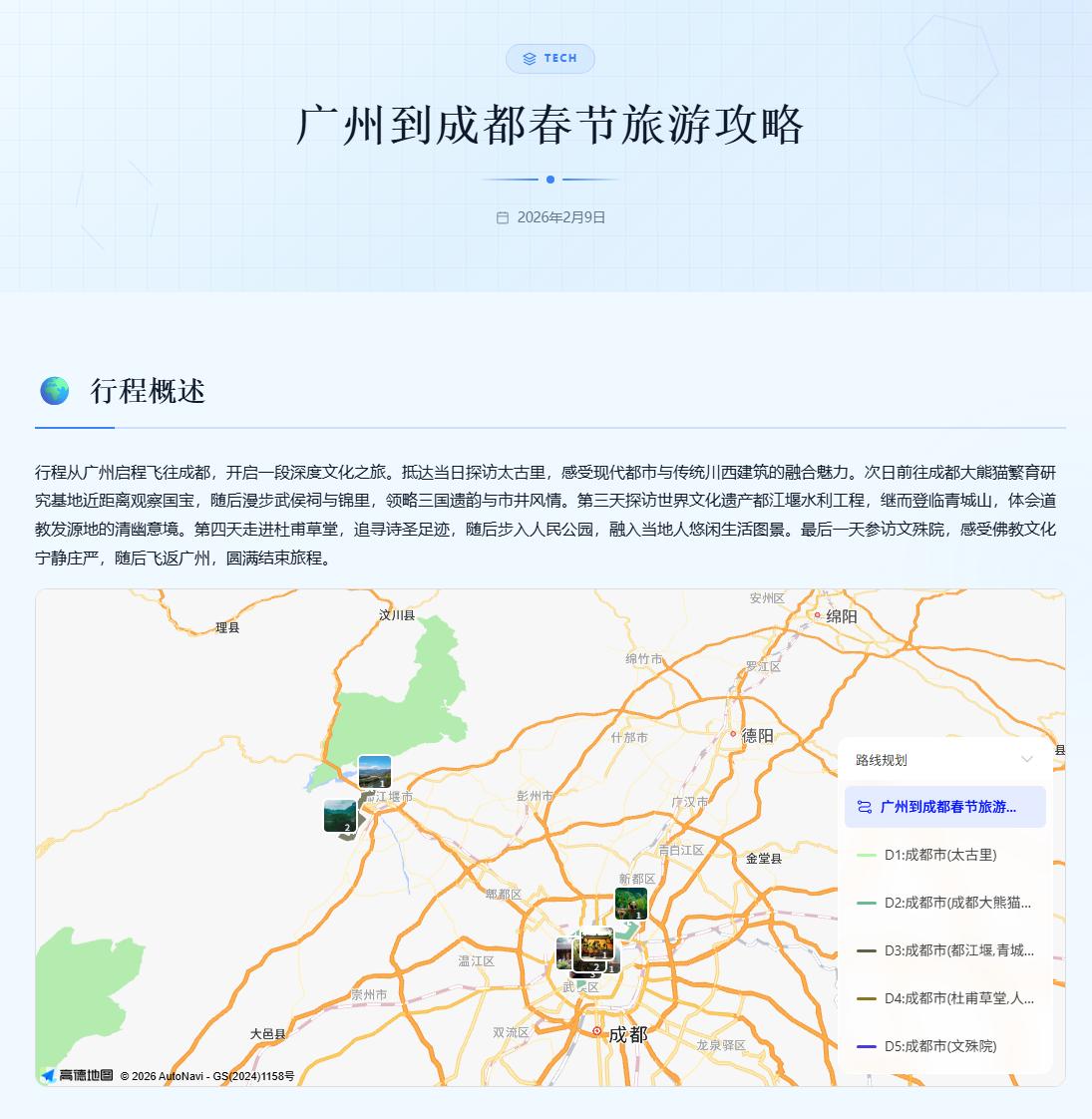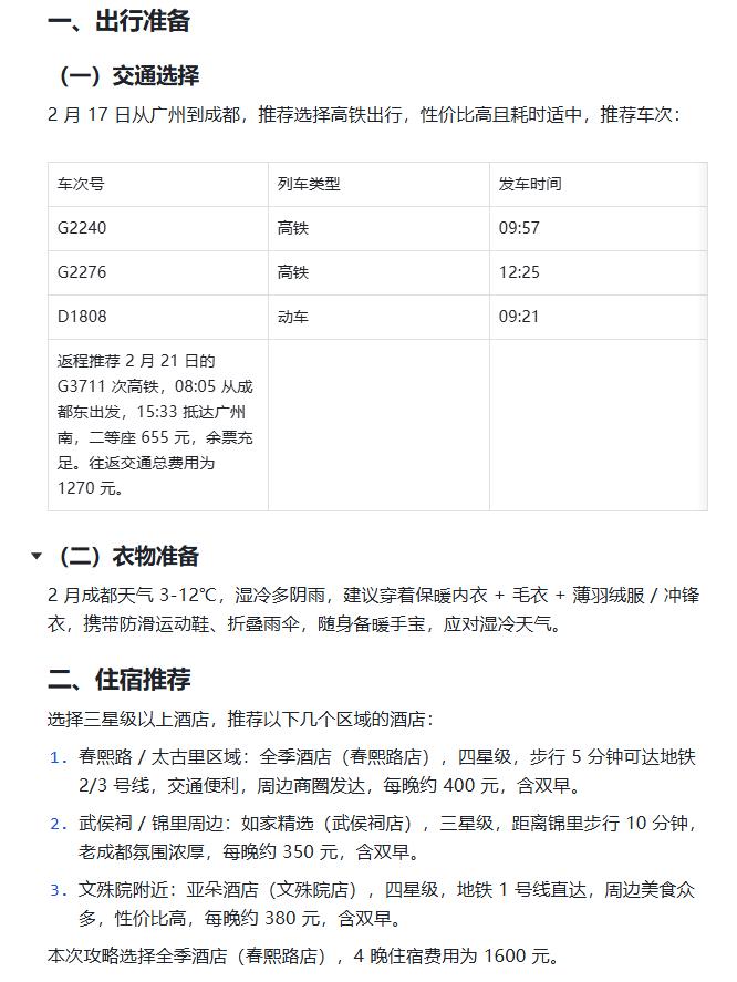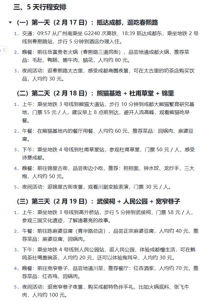 至于后续的几天行程,基本上也都与之前的类似,提供了详尽的介绍和安排,所以也就不再过多赘述了,有兴趣的朋友可以直接点击链接查看《广州到成都春节旅游攻略》。