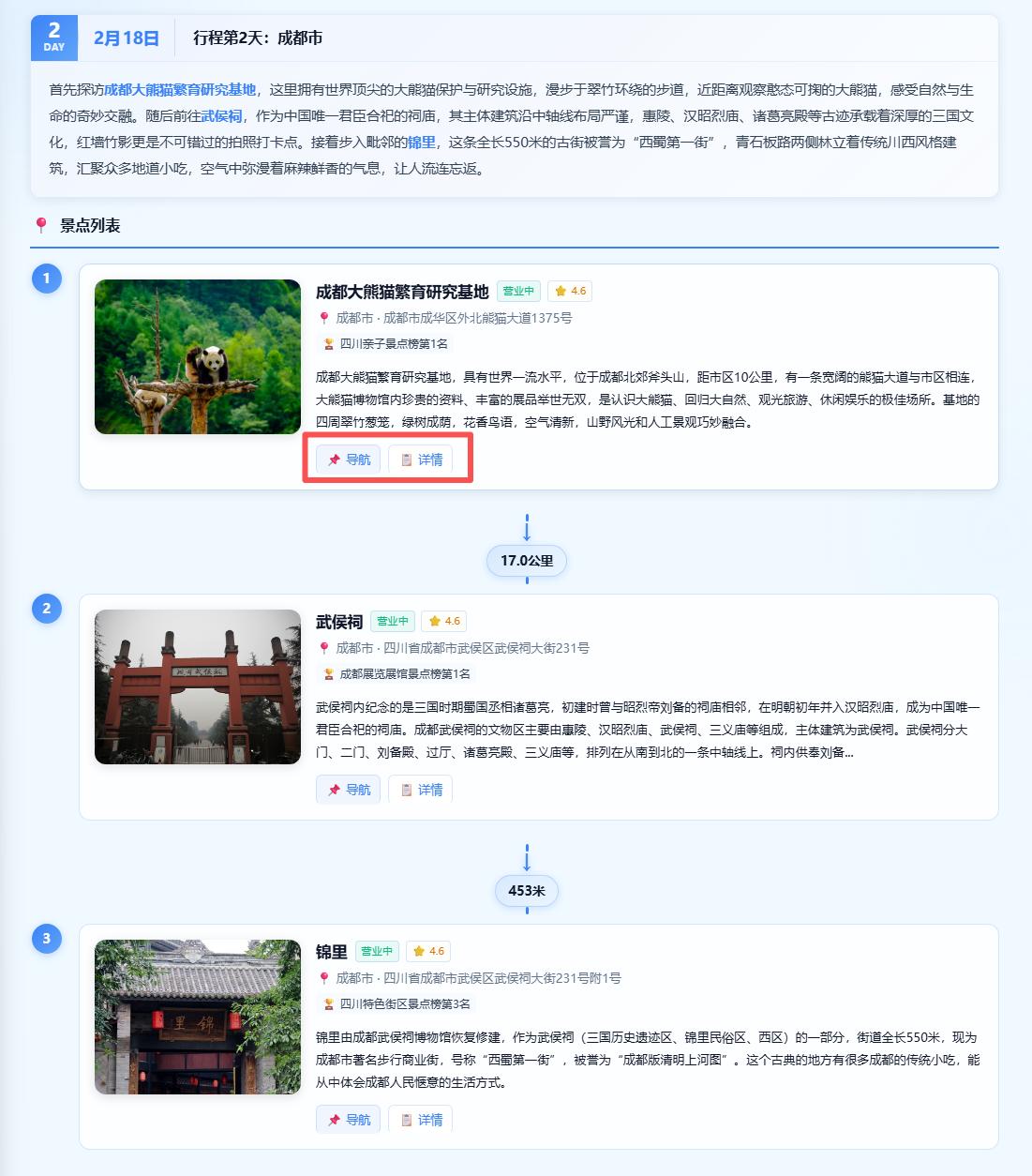在抵达成都的次日,行程就变满了很多,我们将先后游览成都熊猫基地、武侯祠和锦里等景点。其中大熊猫基地在成都市郊区,因为距离较远需要安排更多时间前往,所以排在日程的第一位,然后返程时就可以直接到武侯祠和锦里,两个景点相距仅453米。