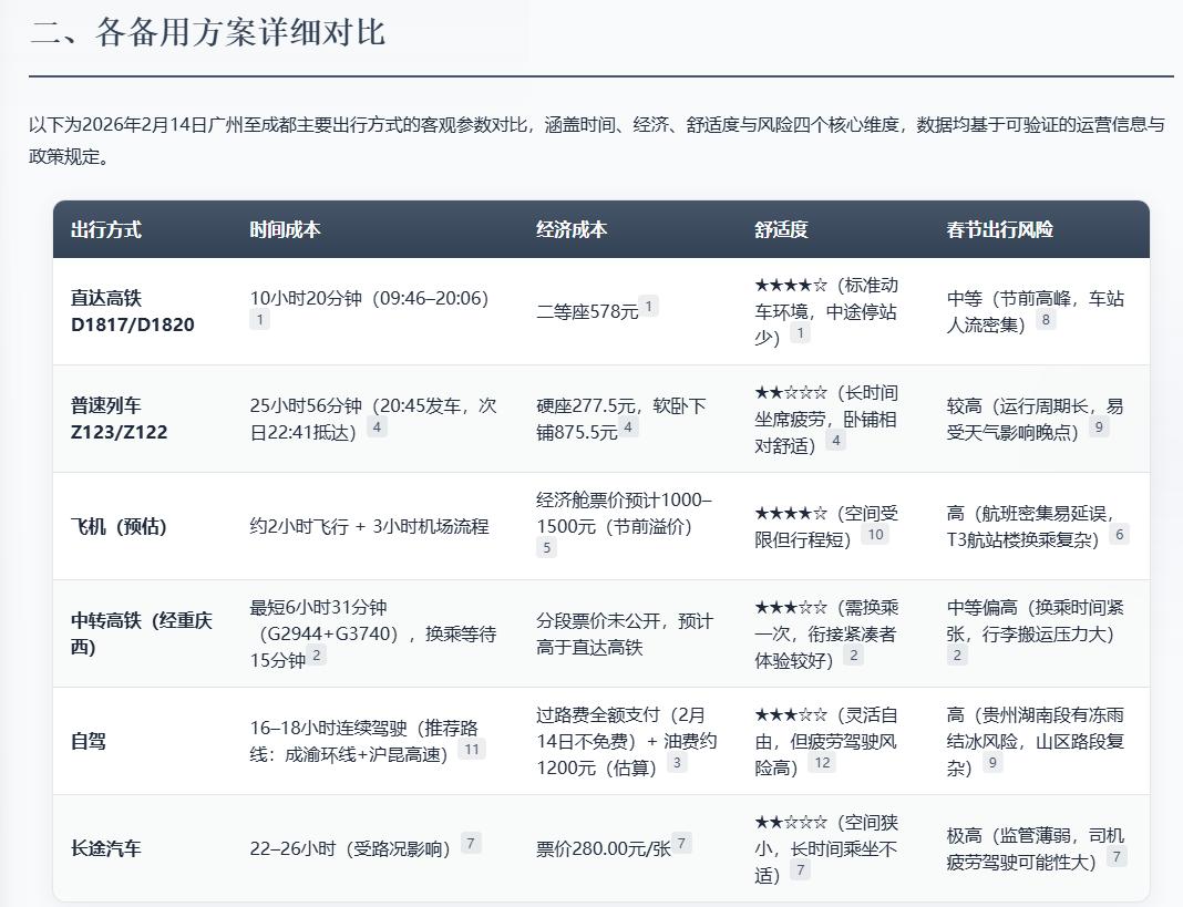 此外还有备选方案:乘坐普速列车,虽然要坐20个小时以上,但是在高铁没票时也是一个选择。至于谨慎选择的方案,则是坐飞机,该方案排名靠后的原因,一是成本较高,单人单程1000-1500元,并且白云机场近期启用了T3航站楼,初次前往的话误机风险不小,所以千问希望用户谨慎考虑。