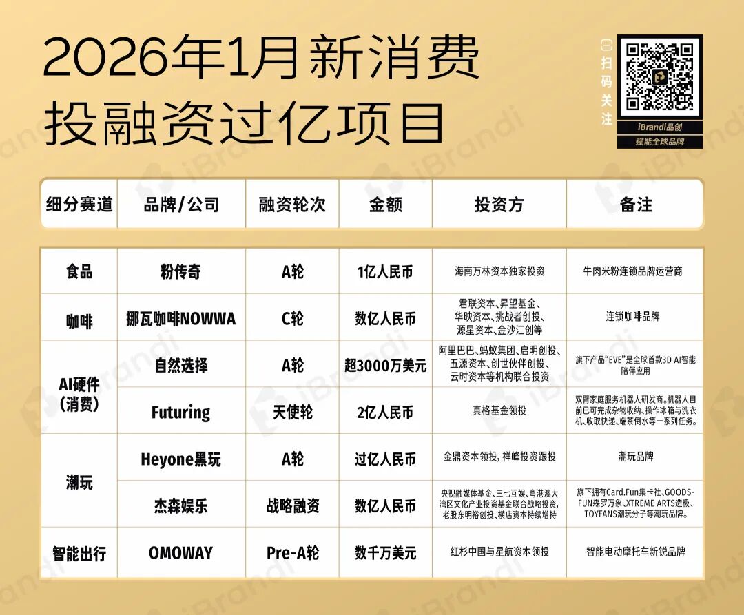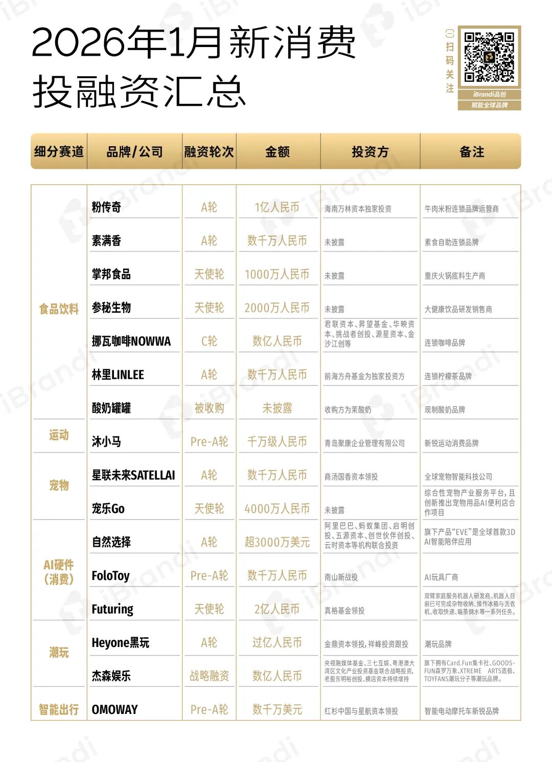 2026年1 月,新消费投融资呈现出一个明显变化:热闹还在,但“想象力叙事”正在让位给更确定的商业路径。以及,吃喝仍是主角,但“消费+AI”正在快速靠前。