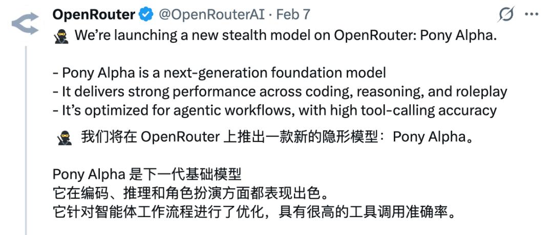 从公开资料来看,Pony Alpha是OpenRouter于2月6日上线的一款“隐身模型”(stealth model),目前完全免费,并可通过OpenRouter调用。
