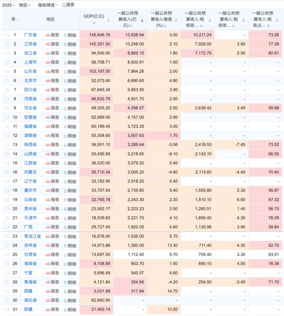 西部和东北的部分省份在增速上表现亮眼,西藏、吉林、新疆等省份在2025年实现财政收入两位数增长,成为榜单中的变量。