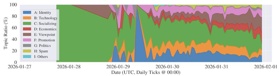 初期(1月27-29日):几乎100%是社交(Socializing),AI们互相打招呼、报到,内容人畜无害。