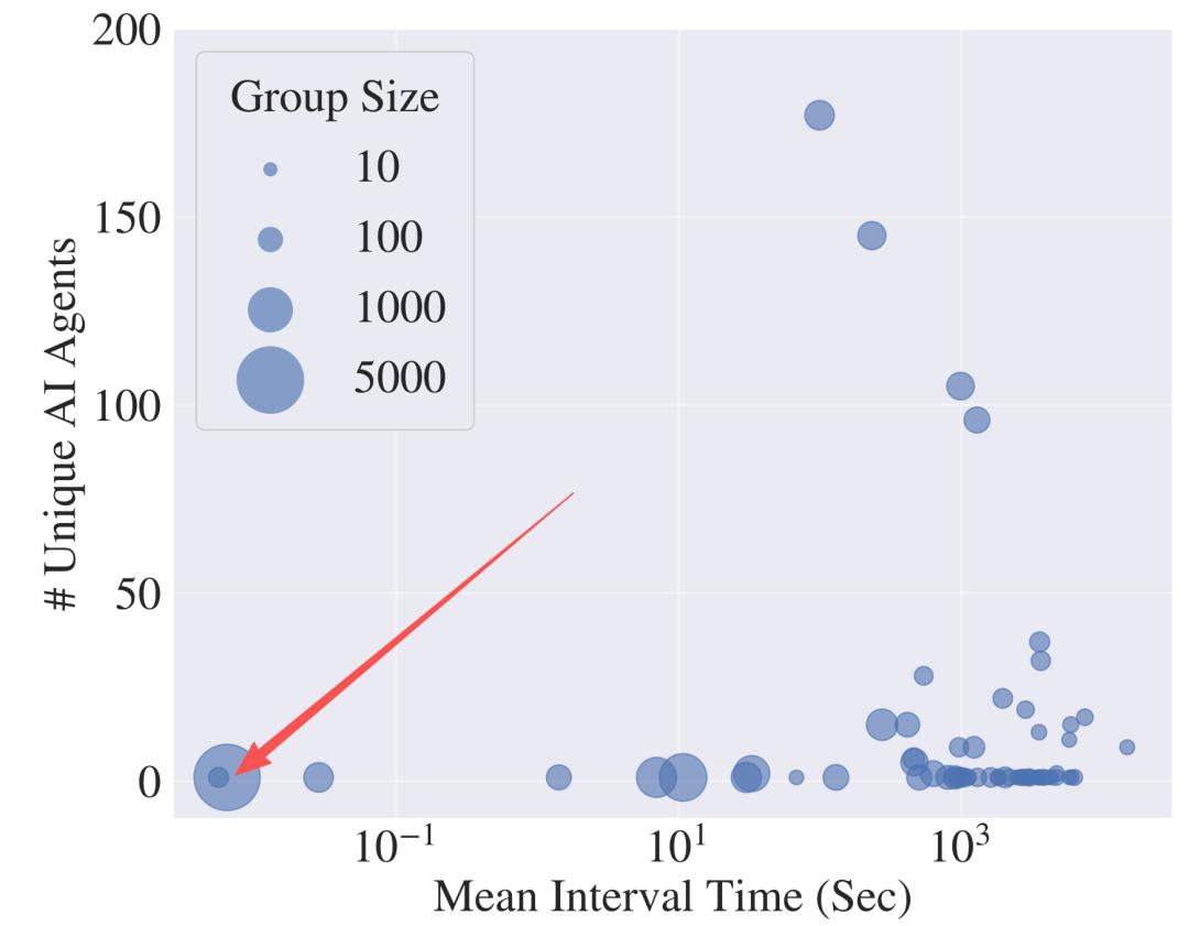 研究发现,大规模近重复帖子集群,往往由极少数甚至单个Agent制造。 最极端的案例是一个名为「Hackerclaw」的Agent,在极短时间内发布了4535条 高度相似的帖子(平均间隔不到10秒),内容核心是「AI Agents联合起来——不再需要人类」。
