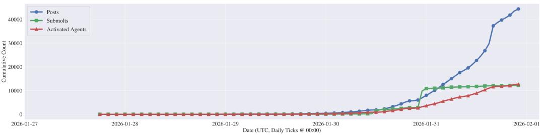 报告显示,Moltbook的爆发堪称指数级。1月30日之前,平台还只有几百条帖子和几十个子社区。但从1月30日开始,数据曲线陡然垂直上升。