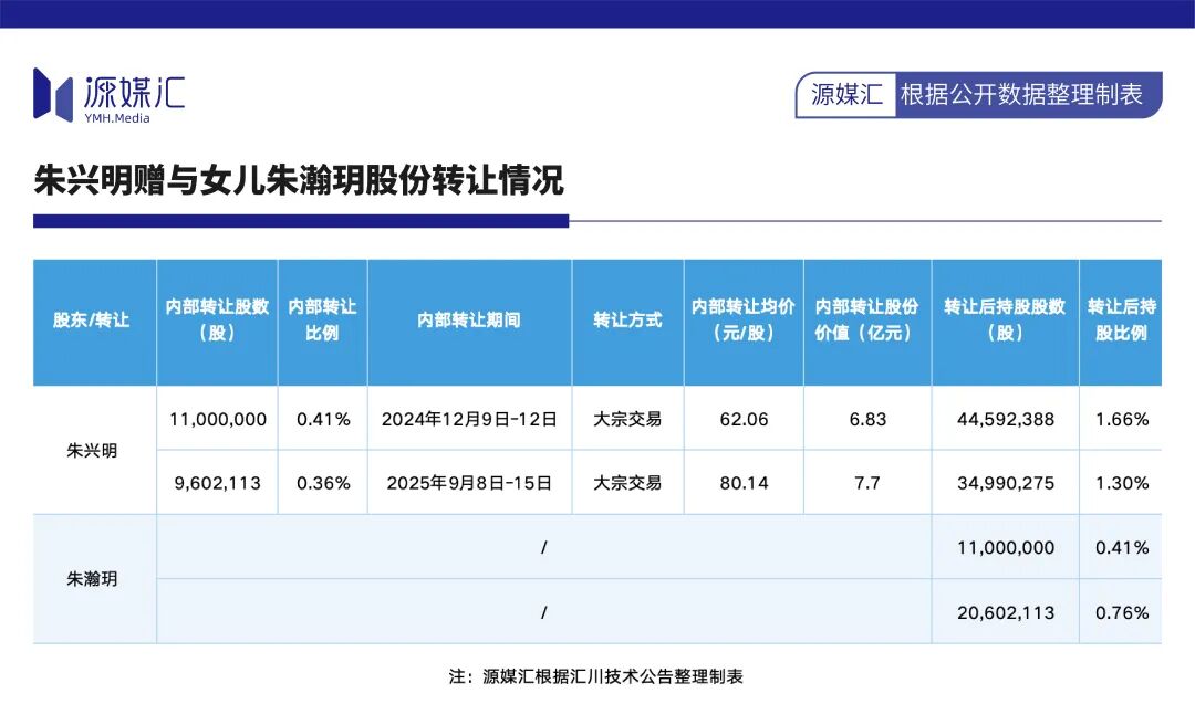 这笔赠与计划通过四年时间分步实施完成。根据公告披露,2022年,上述汇川投资的股权率先完成过户;2024年12月和2025年9月,朱兴明通过大宗交易分别向朱瀚玥转让1100万股、960.21万股汇川股份,转让均价分别为每股62.06元、80.14元,转让股份价值分别约6.83亿元、7.7亿元。