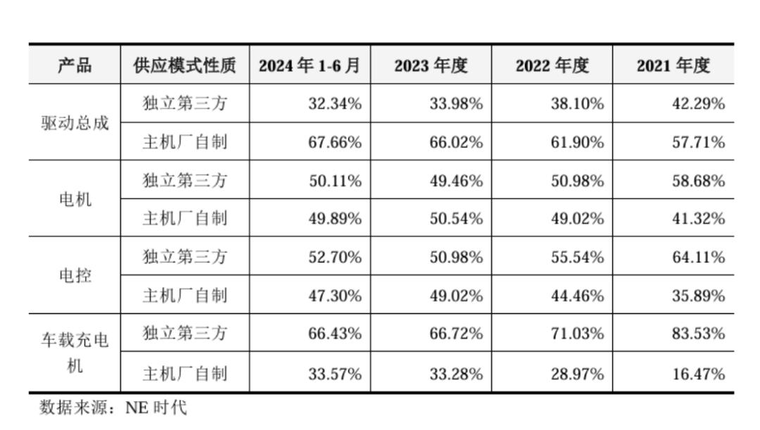 以国内新能源乘用车动力系统产业为例,2021年至2024年上半年,驱动总成由独立第三方供应的市场份额从42.29%降至32.34%,电机58.68%降至50.11%,电控和车载充电机则分别由64.11%、83.53%降至52.7%、66.43%。虽然各自下滑幅度有所不同,但整体均呈现出走低趋势。而主机厂自制份额在零部件市场则呈现出不同幅度的走高。