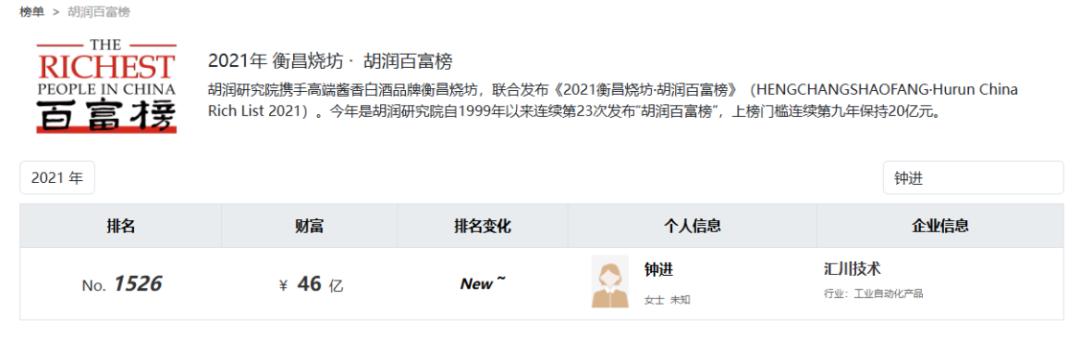 2021年7月9日,朱兴明与妻子钟进解除婚姻关系,并将其名下约7030.03万股汇川股份分割给后者,占彼时公司股份总数的2.6822%。按公告当日每股79.2元的收盘价计算,这批股票价值约55.68亿元。这也让钟进身家暴涨,跻身当年胡润百富榜第1526位。