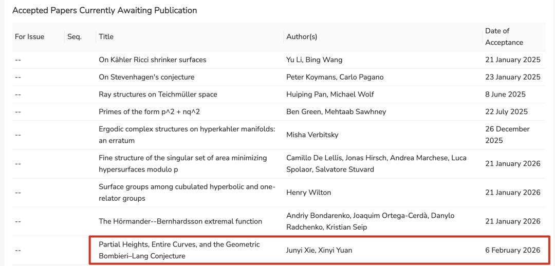论文早在2023年5月便上传至预印本平台arXiv,历经近3年的审稿后终获正式接收。这也是袁新意第5篇被数学四大刊接收的文章、回国后的第3篇,同时也是谢俊逸回国后被四大刊接收的第3篇。