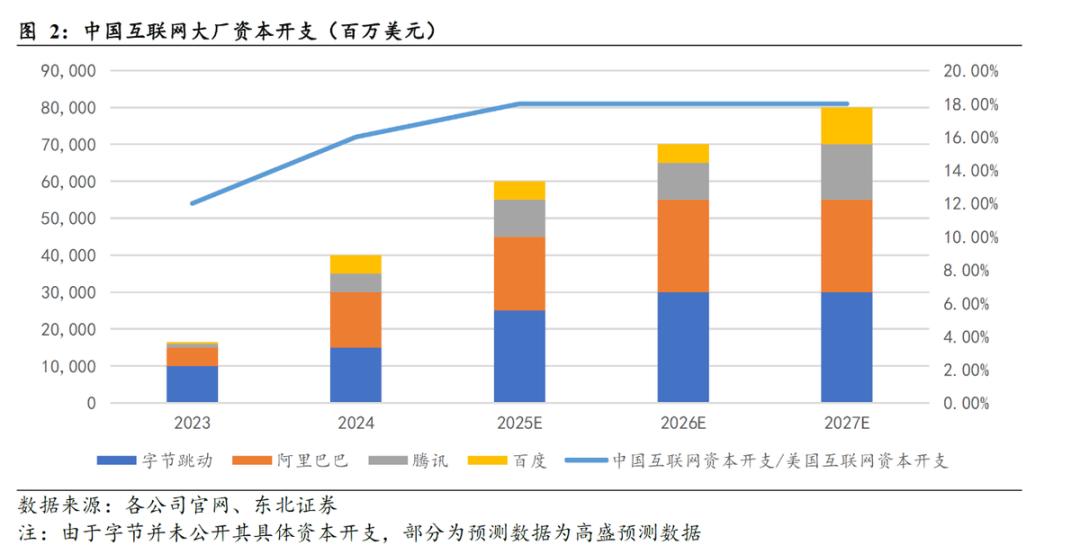 与此同时,中国互联网大厂(BAT+字节)虽然受限于芯片供应,投入体量与美资巨头存在差距(2025年预计约为600亿美元),但也构成了全球AI基建的另一重要增长极。