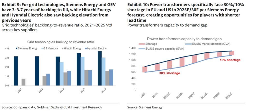 在美国,本土供应商目前仅能满足约 30% 的需求,即便包含已宣布的扩产计划,到 2027 年(预测)也仅能满足约 40%,这导致2025 年欧盟 / 美国电力变压器短缺率约 30%,关键变压器的交付周期已从过去的6-9个月暴涨至2-3年,直接封死了电网快速扩容的可能性。