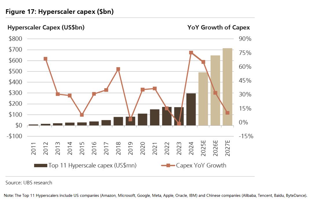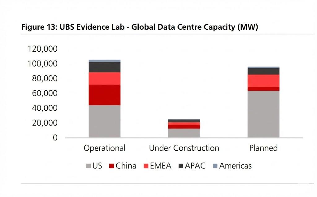 根据UBS数据,截至2025年底,全球数据中心投运容量为105 GW, 同时有25GW的在建容量,以及超过100GW处于规划阶段。