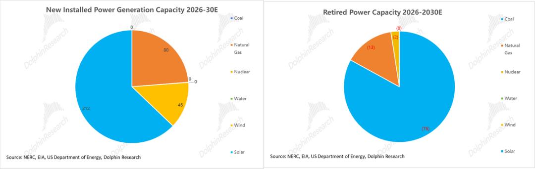 基于 EIA、NERC 及美国能源部的规划指引,海豚君对未来五年(2026-2030E)发电能源新增供给做了以下预测: