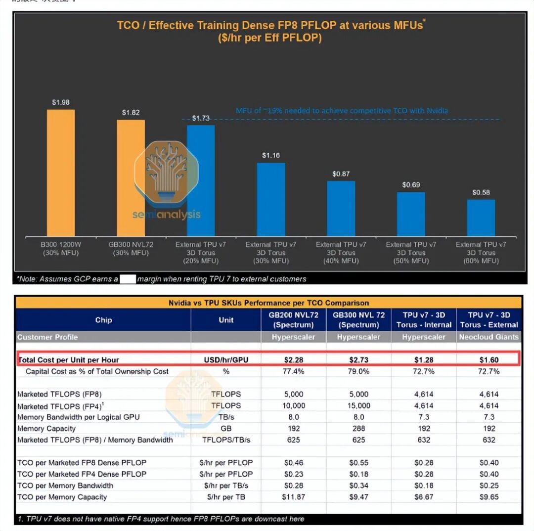 但随着Google TPU等自研芯片在推理和特定训练场景的渗透,成本将显著下降。TPU V7不仅单位算力TCO比GB300便宜41%,其在能耗和散热上的优势使其Capex有望缩减至GPU方案的一半(约275亿美元/GW)。