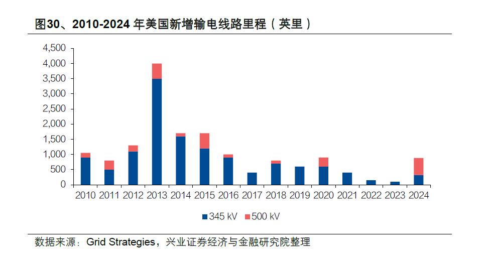 2013年后美国新增高压输电线路年里程已经大幅缩减,2024 年仅新增888 英里345KV 及以上的高压输电线路,不足美国能源部(DOE)年均规划需求5000英里的20%。