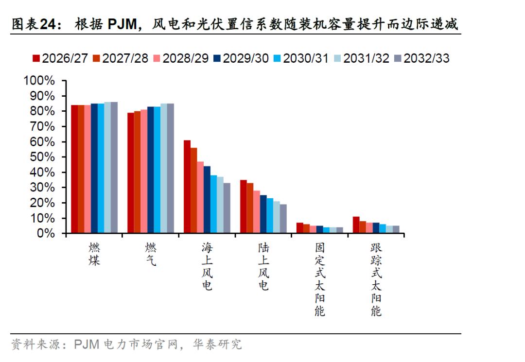 且由于不同电源在电网顶峰时刻的可靠出力(有效容量)贡献差异巨大。海豚君对上述净增245GW装机按有效容量系数折算(煤/气/核/水/风/光分别取90%/90%/95%/80%/40%/10%),未来五年美国电力系统新增的有效净容量仅有约28GW。
