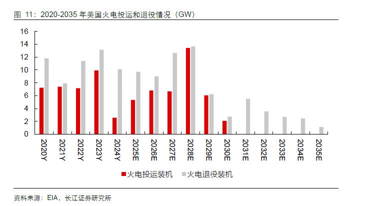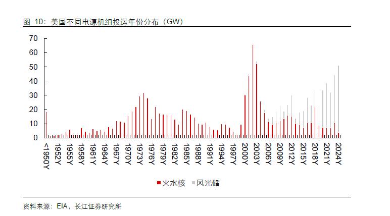 “高龄”危机: 528 GW(占比超50%)的优质基荷电源(火、水、核)服役已超 30 年,导致美国自 2010 年即进入火电退役高峰。更为严峻的是,根据EIA预测,2020-2030 年,每一年基荷机组的退役量均大于其新增量,这意味着,在AI需求爆发前夕,系统的“可靠容量”已在持续净流失。