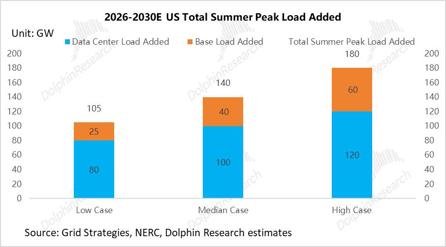② 基础负荷: 尽管 FERC 预测由终端电气化和制造业回流驱动的新增负荷高达 76GW,但考虑到美国电动车普及率放缓及制造业回流实际落地的复杂性,海豚君预测未来5年基础负荷增量为 25GW / 40GW / 60GW(对应CAGR 0.6%-1.5%)。