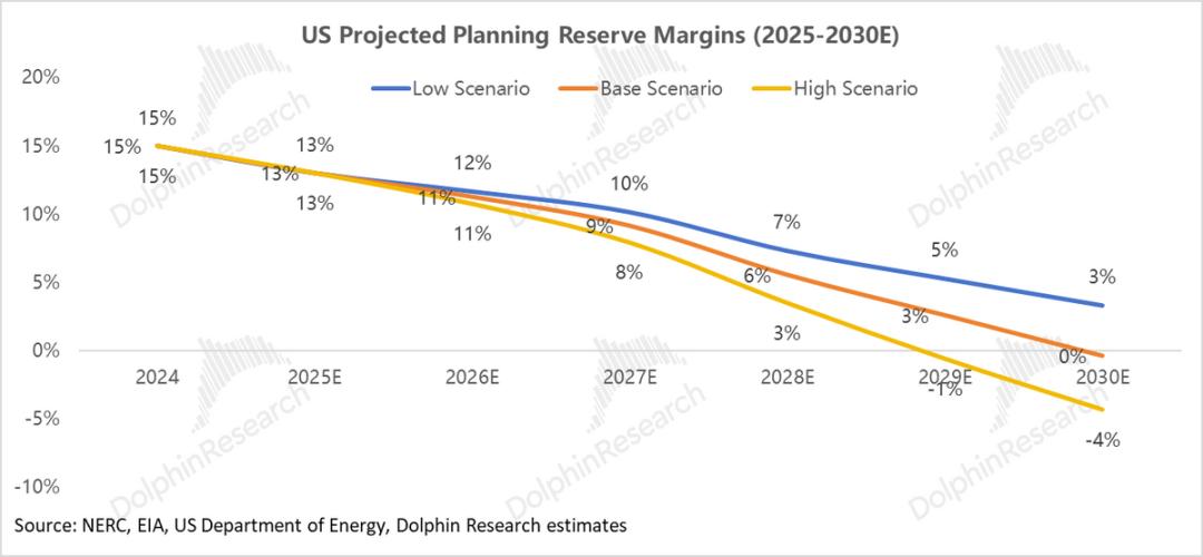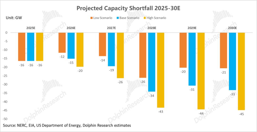 海豚君假设未来系统备用率与2024年持平(15%),结合需求端 AI 负荷的爆发,海豚君预测到2030 年,美国电力系统将出现巨大的可靠性缺口。低、中、高需求情景下的缺口规模预计将分别达到 109GW、149GW和195GW。