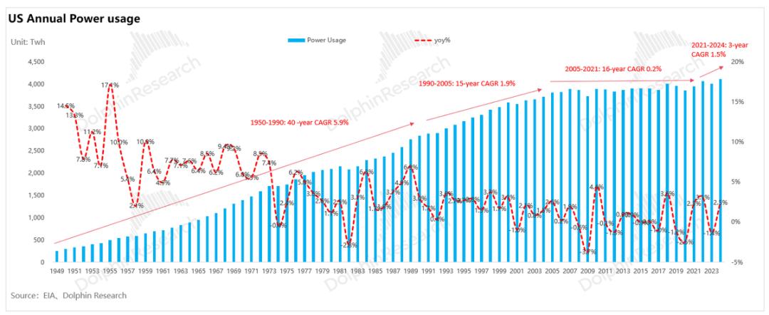 高速增长期 (1950s-1990s):受益于战后经济繁荣、重工业化扩张以及居民电气化普及(如空调家电),美国用电负荷维持高位增长(CAGR增速6%)。