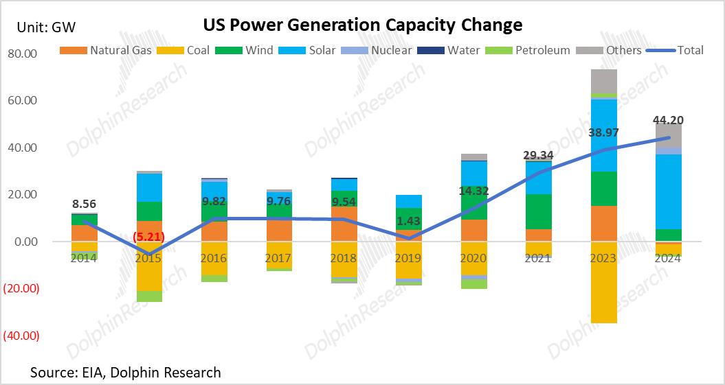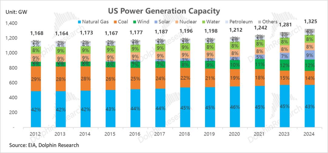 过去十年(2014-2024),美国电力系统在总量微增(CAGR增速仅1.2%)的表象下,发生了发电结构端的剧变,为当前的缺电危机埋下了供给侧的病根: