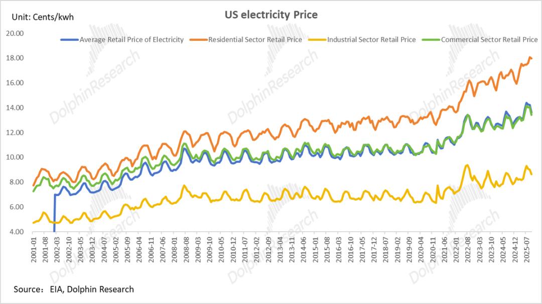 两者共振下,美国用电重回增长通道,2021-2024 年平均增速回升至 1.5% 左右,电价从 2022 年起加速上涨。