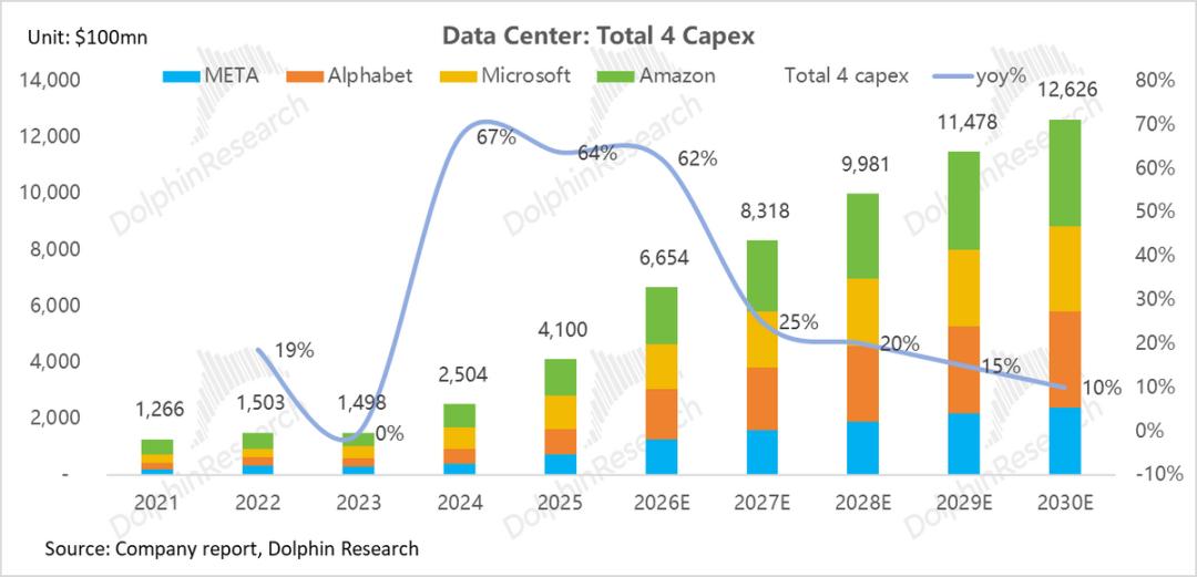 若AI数据中心相关支出占比达到80%-90%,这意味着26-30年间CSP年均总资本开支将达到9000亿-1.2万亿美元(2026年约6500-7000亿美元),基本符合目前产业链维持高斜率的增长预期(26-30年5年CAGR约25%)。