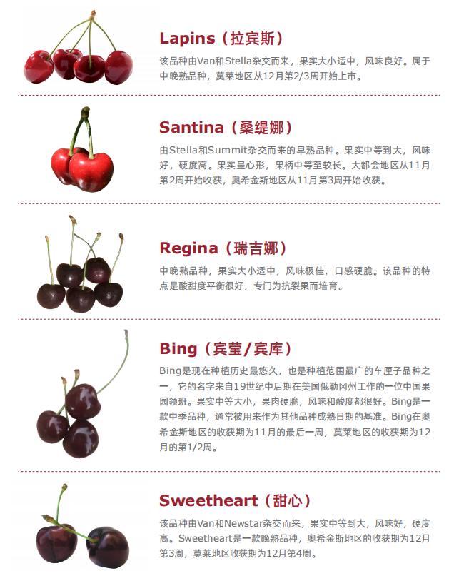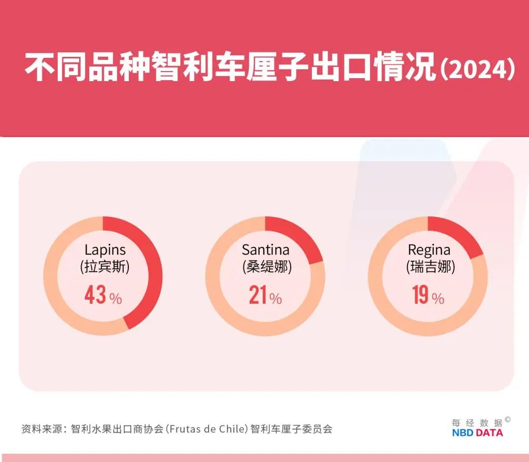 据上述指南,智利车厘子明星品种包括桑缇娜、拉宾斯、瑞吉娜等。2024年,仅拉宾斯一个品种的出口量就占智利车厘子总出口的43%。