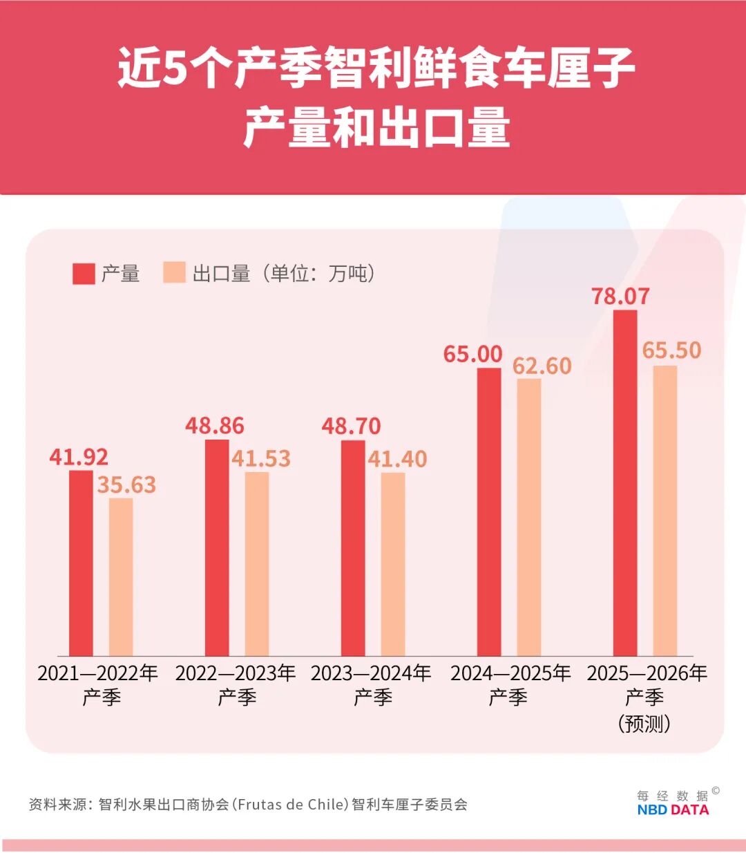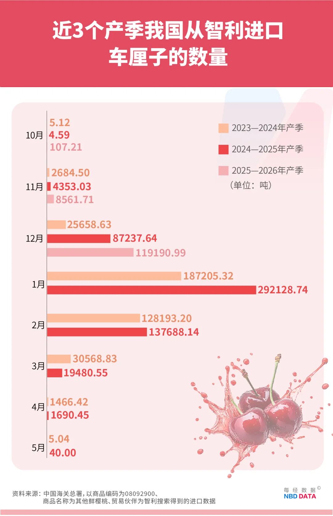 由于市场传导本身存在滞后性,智利本产季的供应变化更让当前市场格局增添变数。克劳迪娅·索莱尔向每经记者透露,受天气条件及采收期提前影响,在2025—2026产季,智利车厘子出口总量已下调至约1.1亿箱,较上一产季减少12.1%。同时,大量车厘子集中于1月涌入市场,因此预计2月出口量将明显低于往年水平。