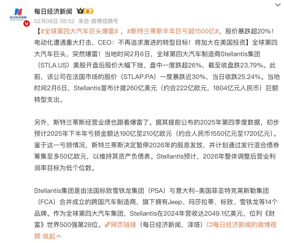 全球第四大汽车集团Stellantis,直接「暴雷」:上半年巨亏超190亿欧元(折合人民币约1550亿元),股价单日暴跌26%,暂停2026年全部股息发放,甚至把全年营业利润率目标,砍到「低个位数」。