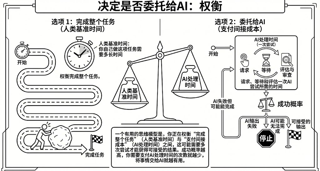 一个实用的思考模型可以这样:你是在“独立完成整个任务”(人类基准时间)与“支付管理开销”(AI 处理时间)之间进行权衡。你可能需要支付多次开销,直到获得满意的结果。成功概率越高,你支付 AI 处理时间的次数就越少,将任务交给 AI 的性价比就越高。举个例子,假设一项任务你自己做需要一小时,AI 几分钟就能做完,但检查答案需要三十分钟。在这种情况下,只有在成功概率极高时才应该交给 AI,否则你花在生成和检查草稿上的时间比你自己动手还要多。然而,如果人类基准时间是 10 小时,那么即使要花几个小时和 AI 磨合也是值得的,前提是 AI 最终能胜任这份工作。