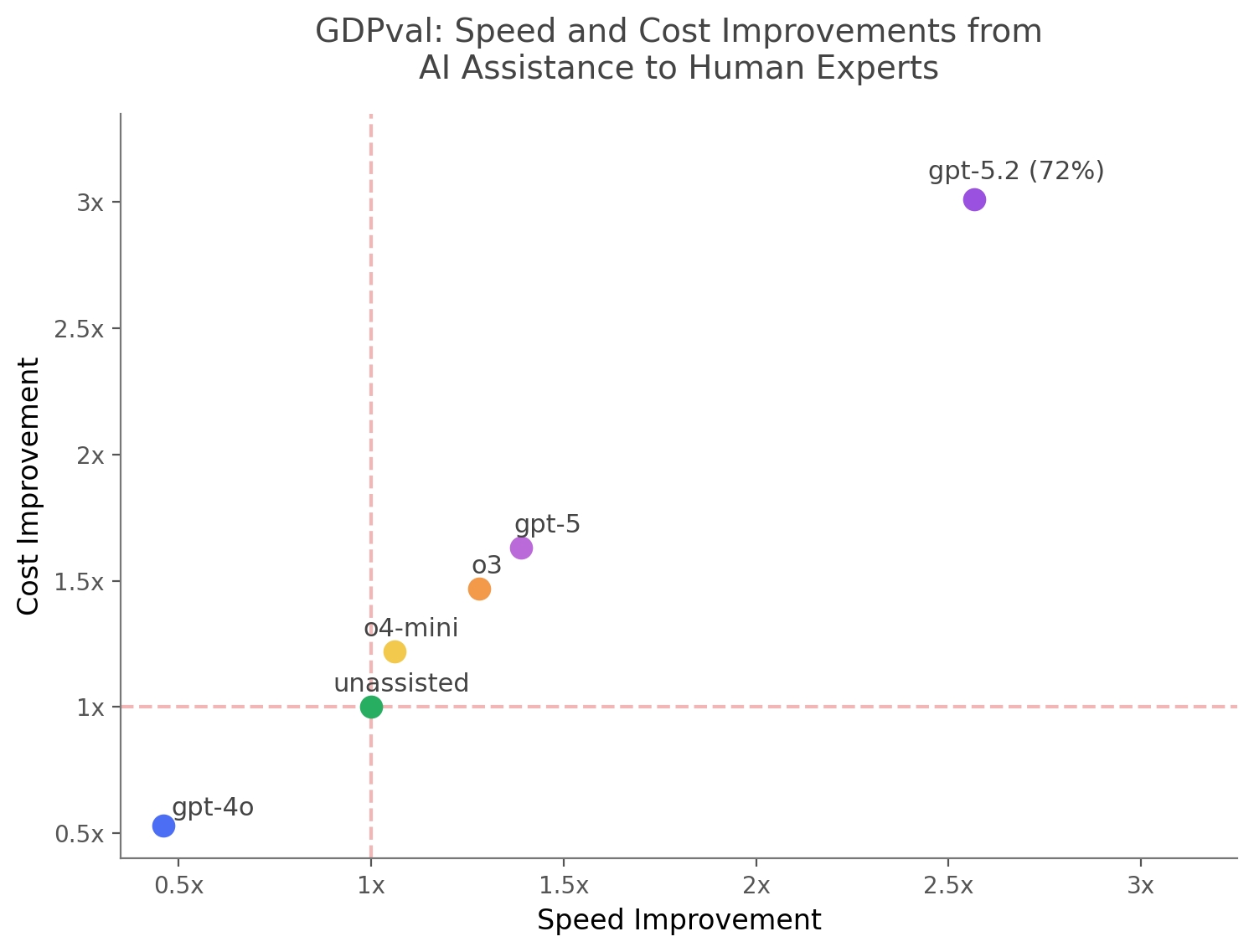 在“草稿 → 审核 → 必要时重试”的工作流下,AI 辅助完成 GDPval 任务带来的速度和成本提升(相对于未受辅助专家的 1x 基准)。GPT-5.2 的数据点是基于其在 GDPval 中约 72% 的胜平率进行的推测;其他模型的数据点来自 GDPval 论文。现实世界的结果会因任务而异:有些任务是“轻松取胜”,有些是明显失败,而最棘手的情况是那种“看起来没问题其实有错”的失败。