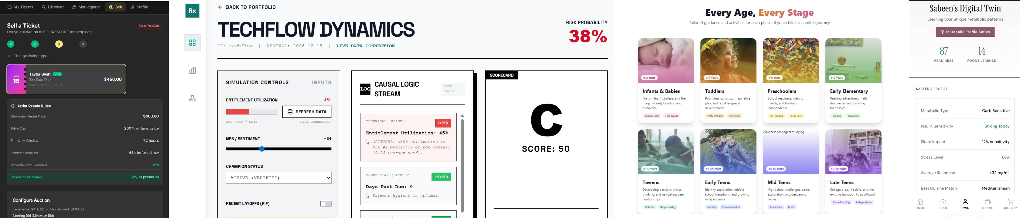 演示案例包括:由 Dee Sethmajhi、Jane Lian Wang 和 Yue Ma 开发的 Ticket Passport(一个验证票务销售市场);由 Whit Chiles、Jose Olivares 和 Spencer Louie 开发的 Revenue Resilience(识别小企业的收入风险并创建智能体解决方案);由 Manoj Massand、Samuel Lee 和 Harry Lu 开发的育儿伴侣(将孩子的兴趣与活动匹配);以及由 Angela Argentati、Sabeen Chawla 和 Adeel Rizwan 开发的 Invive(血糖预测)。(还有很多其他优秀的项目,但这几个团队授权我可以分享截图!)