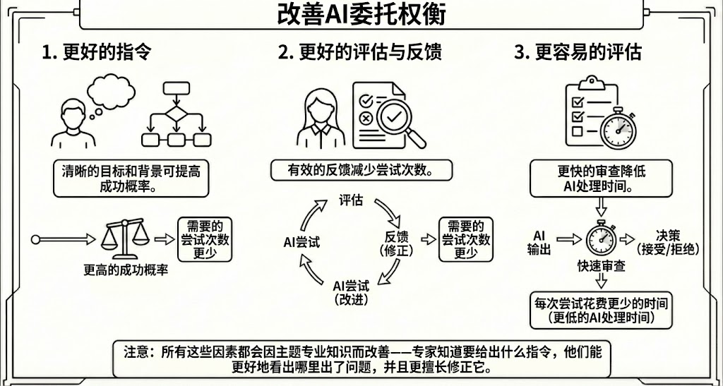 为了让向 AI 委派工作更划算,我们可以通过三件事来提高成功概率并降低 AI 处理时间。首先,我们可以提供更好的指令,设定清晰的目标,让 AI 有更高的执行成功率。其次,我们可以提高评估和反馈的效率,从而减少让 AI 步入正轨所需的尝试次数。最后,我们可以简化评估过程,用更少的时间判断 AI 的表现优劣。所有这些因素都依赖于专业领域知识——专家知道该下达什么样的指令,能更敏锐地发现问题,并能更有效地纠正错误。