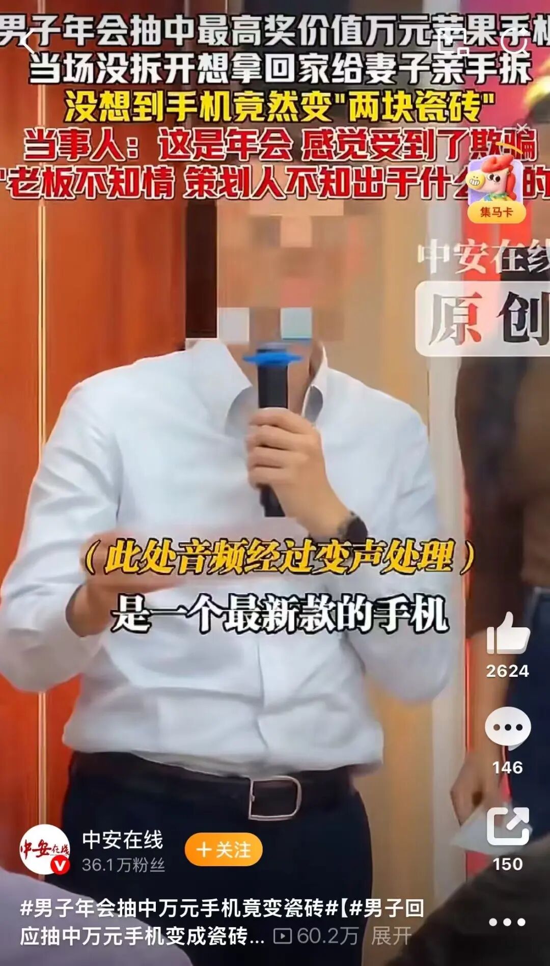 2月5日,广东珠海某员工在年会上抽到一台苹果手机,老板宣称该奖牌价值9988元。