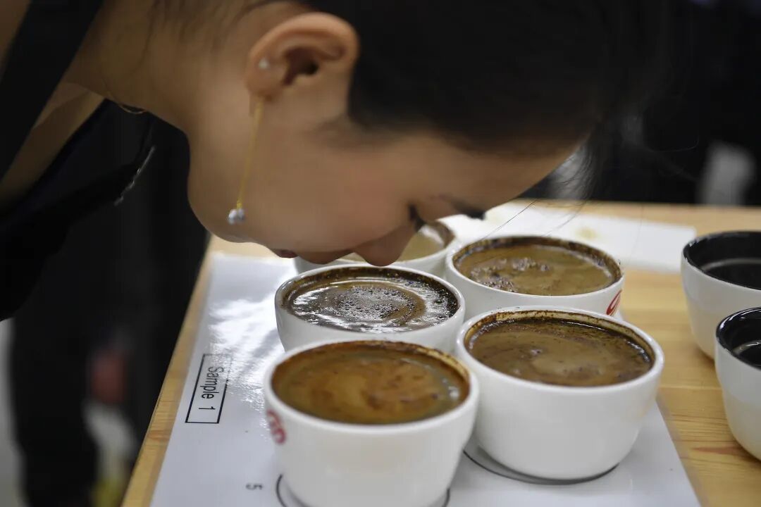 △云南咖啡生豆大赛上,评委品味咖啡的香气。(图/刘冉阳/中新社云南分社/视觉中国)