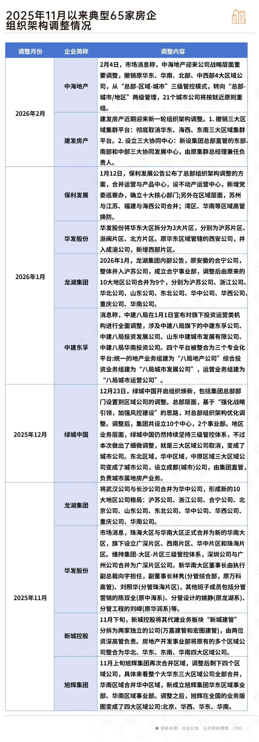 据不完全统计,自2025年1月至2026年2月9日,重点65家房企中,已有21家房企合计进行了31次组织架构调整。