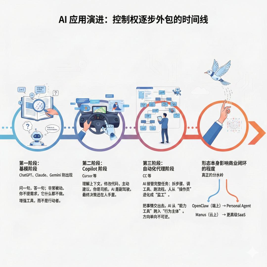 回头看这几年的 AI 应用演进,你就会发现这就是控制权逐步外包的时间线。