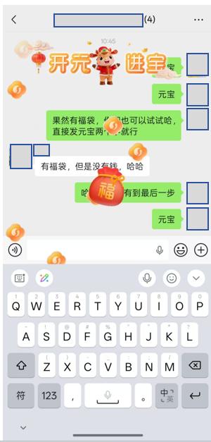 见实测试后发现,在微信私聊或群聊界面发送“元宝”,屏幕上方会掉落福袋,并弹出“元宝祝你开元进宝”字样。