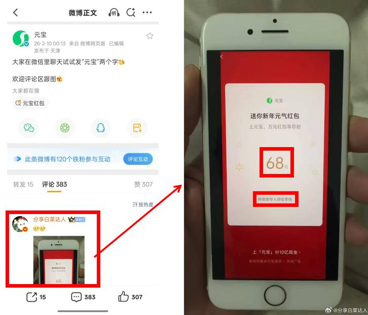 今日凌晨,元宝引导用户在微信聊天里直接发“元宝”两字。有网友在评论区晒出了领到68元的截图,显示“将直接存入微信零钱”。