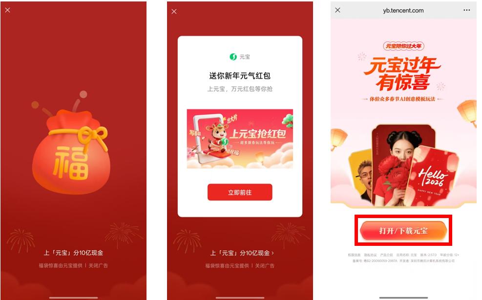 不过,与凌晨刚上线时的大额红包不同,目前点击该福袋,会直接跳转至元宝APP的下载界面,红包应已被领完。