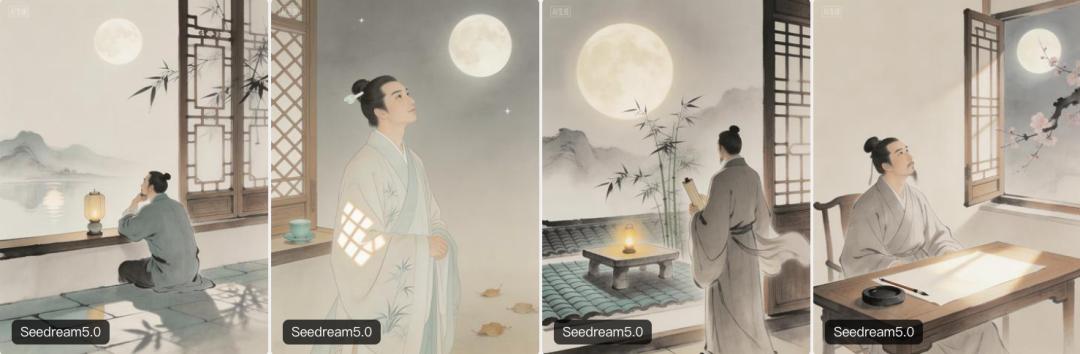 第一个提示词是“为《静夜思》生成古诗插图”,可以看到生成的结果中人物“举头望明月”这一关键元素都没有缺失,还附上了人物在月光下的影子等,但原诗中的“床前”等没有在图片中涉及到。