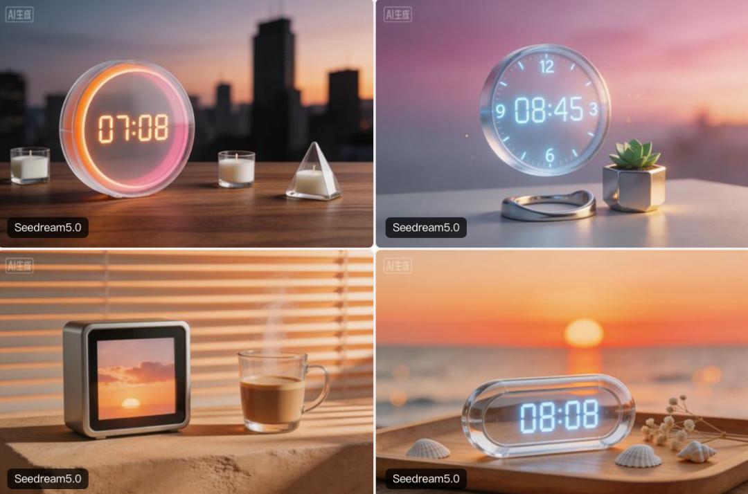 还有抽象的提示词,智东西输入“生成一个静谧科技感且带有落日余晖氛围的闹钟图片”,新模型生成的图片中,从闹钟的设计到背景将落日、科技感融合在了一起。