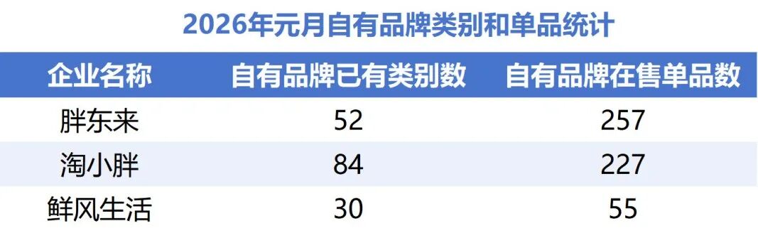 2026年1月,三个体系的自有品牌类别数和单品数见下图: