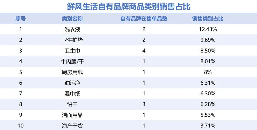 鲜风生活的自有品牌大单品,均出现在较小的品类中,说明没有去跟风、模仿,而是根据自身的客群为切入点,在企业的发展和自有品牌的打造中,以质价比为锚,稳健的操作手法。