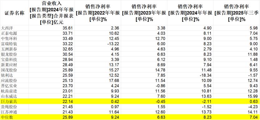 2022—2024年及2025年前三季度,巨力索具的毛利率分别为17.7%、21.22%、20.4%和18.38%,与行业中位数基本处在同一水平线上。