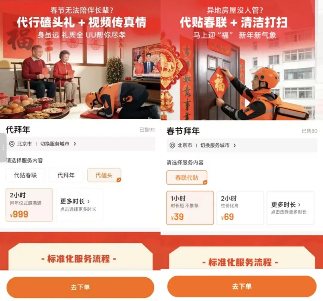 相比于需要重资产投入的无人机配送,或是需要建立标准化服务体系的家政业务,“代拜年”尤其是“代磕头”,是一个近乎“零成本”的创新。它不需要研发新设备,不需要培训新技能(理论上人人都会磕头),只需要在现有跑腿服务的框架下,增加一个服务选项,设计一套话术和流程即可。